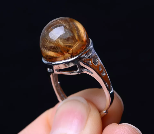 NATURAL GOLD HAIR RUTILATED QUARTZ CIRCULAR BEAD RING Silver Plated ADJUSTABLE