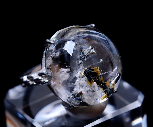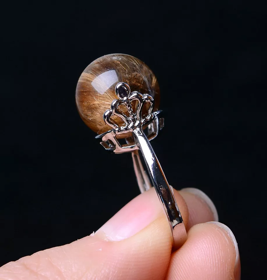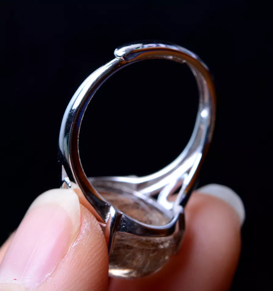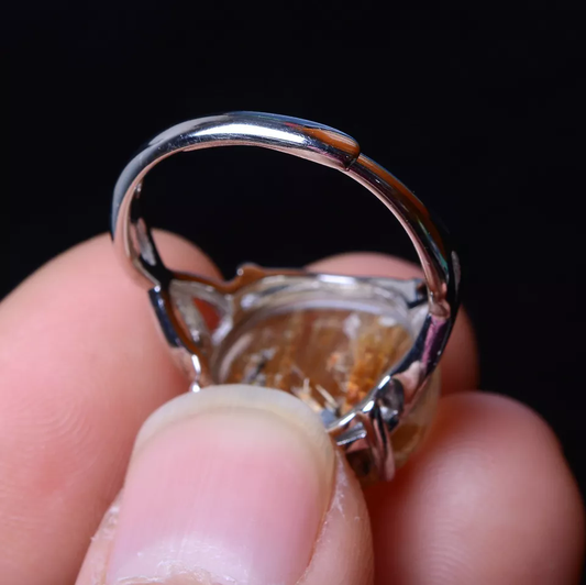 Natural Gold Rutilated Quartz Crystal Woman Cure Ring Silver Inlaid Adjustable