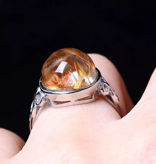 18.21CT BEAUTIFUL NATURAL CALCITE GOLD RUTILATED QUARTZ CRYSTAL RING ADJUSTABLE